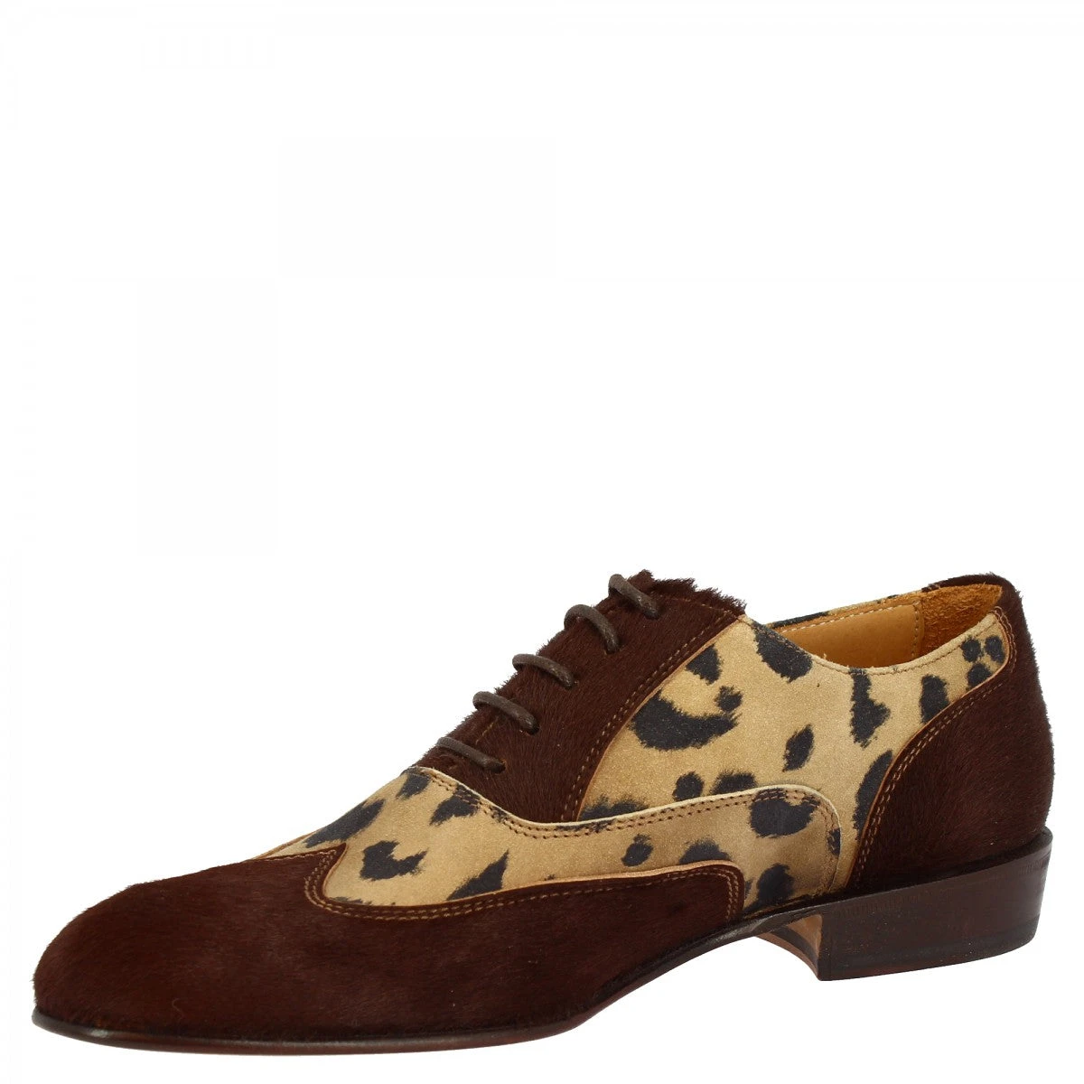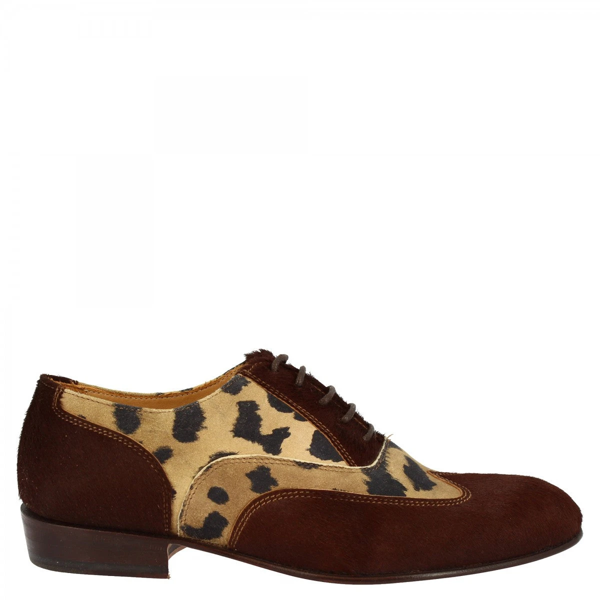 Women’s oxford shoes in dark brown pony skin, leopard pattern, with leather sole, handmade in Italy.