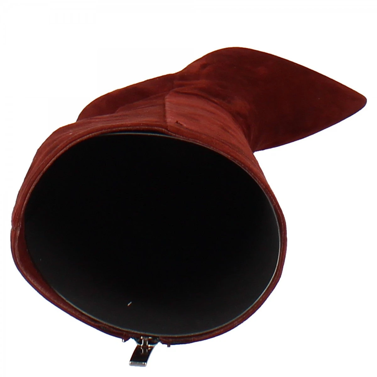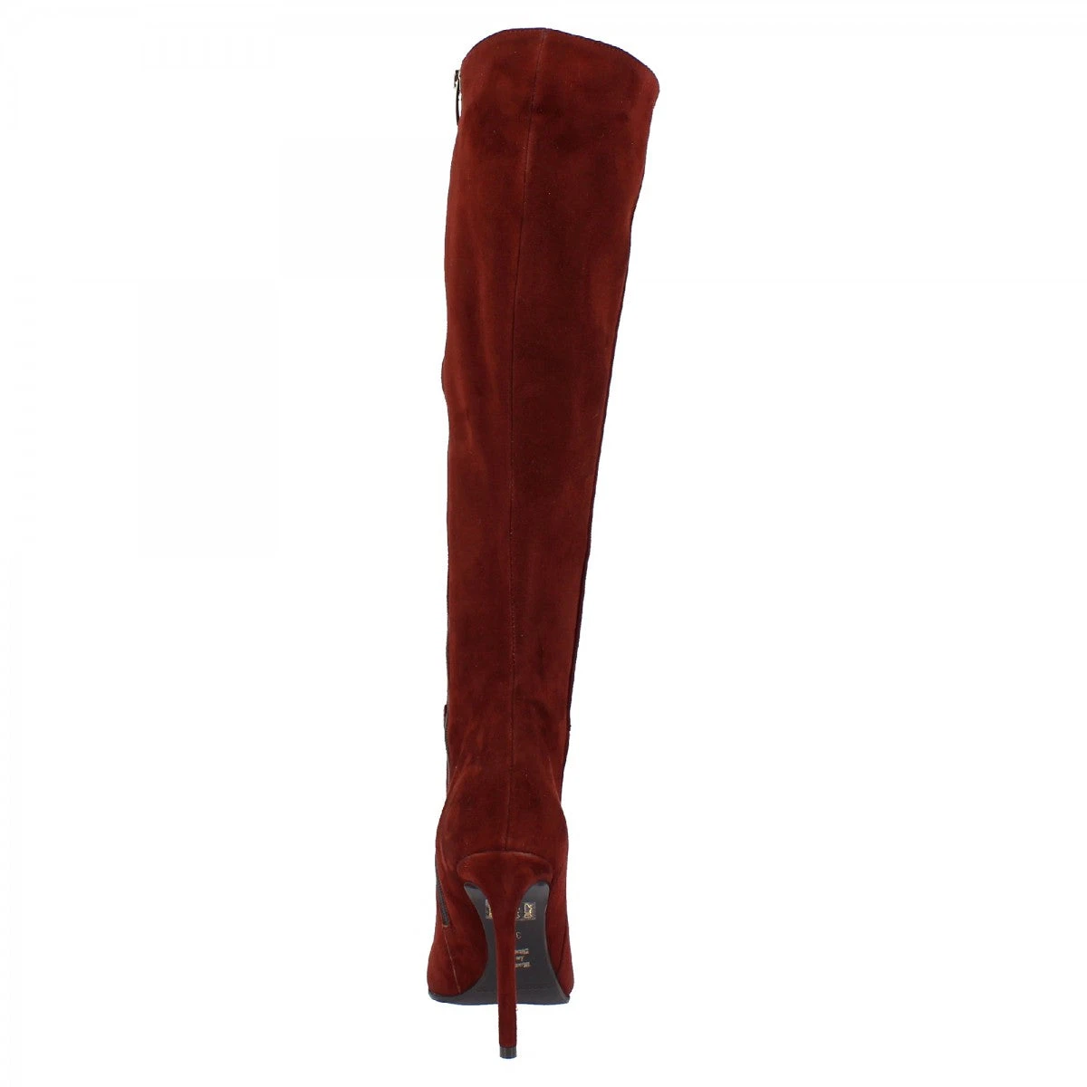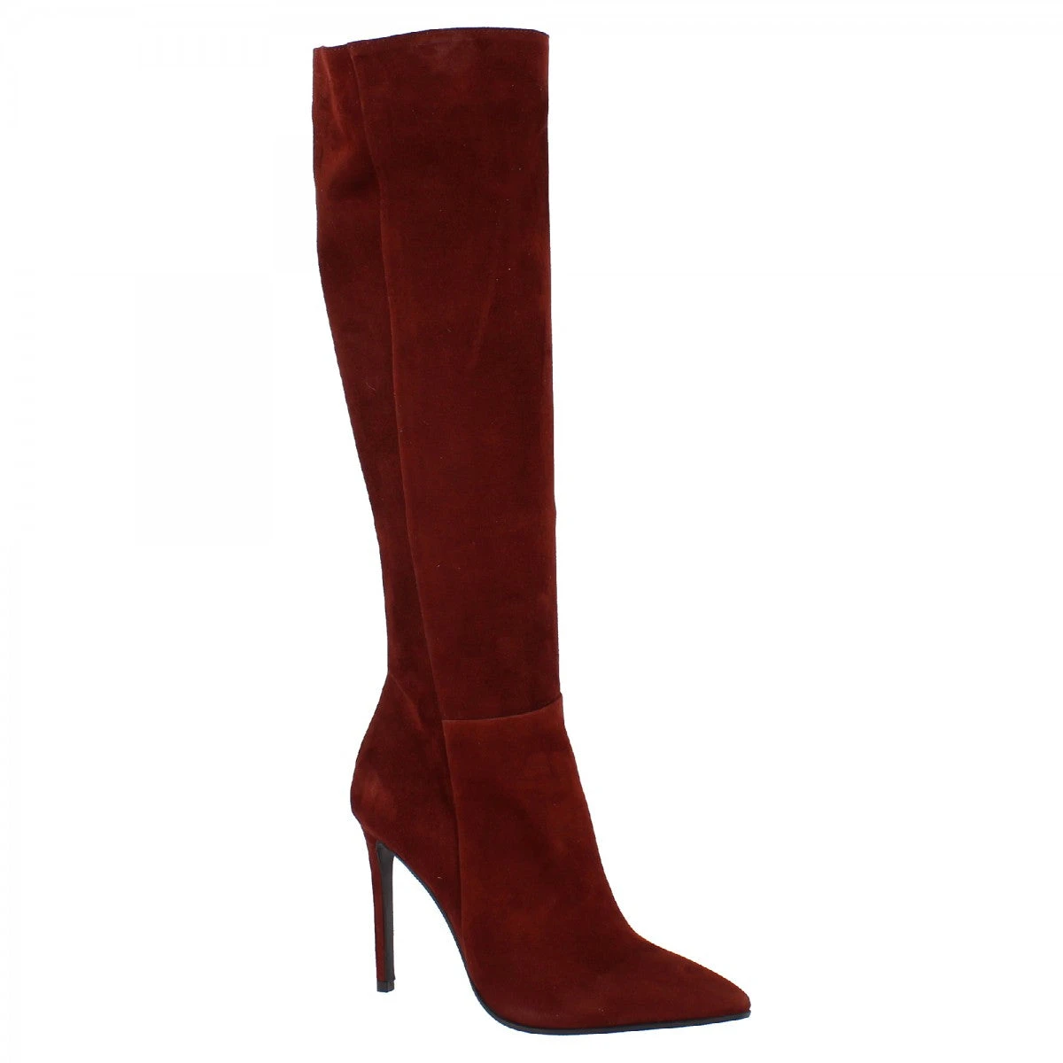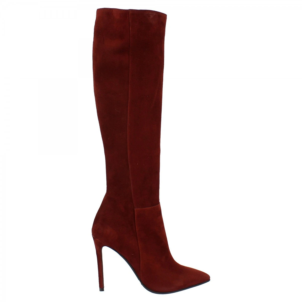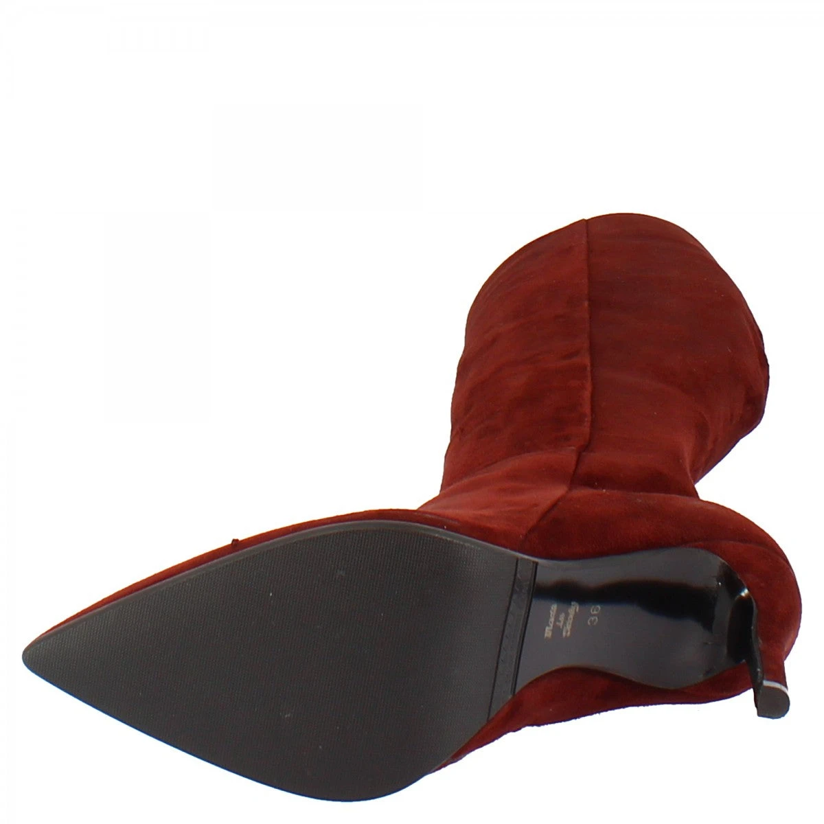 Women’s pointed toe stiletto heel boots in LEATHER burgundy suede with rubber SOLE, side zip closure, handmade in Italy.