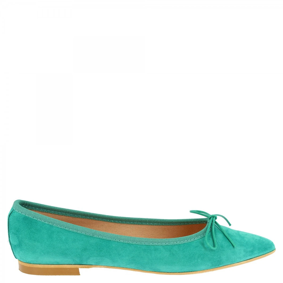 Pointed toe women’s ballet flat made with an artisanal workmanship in turquoise suede leather